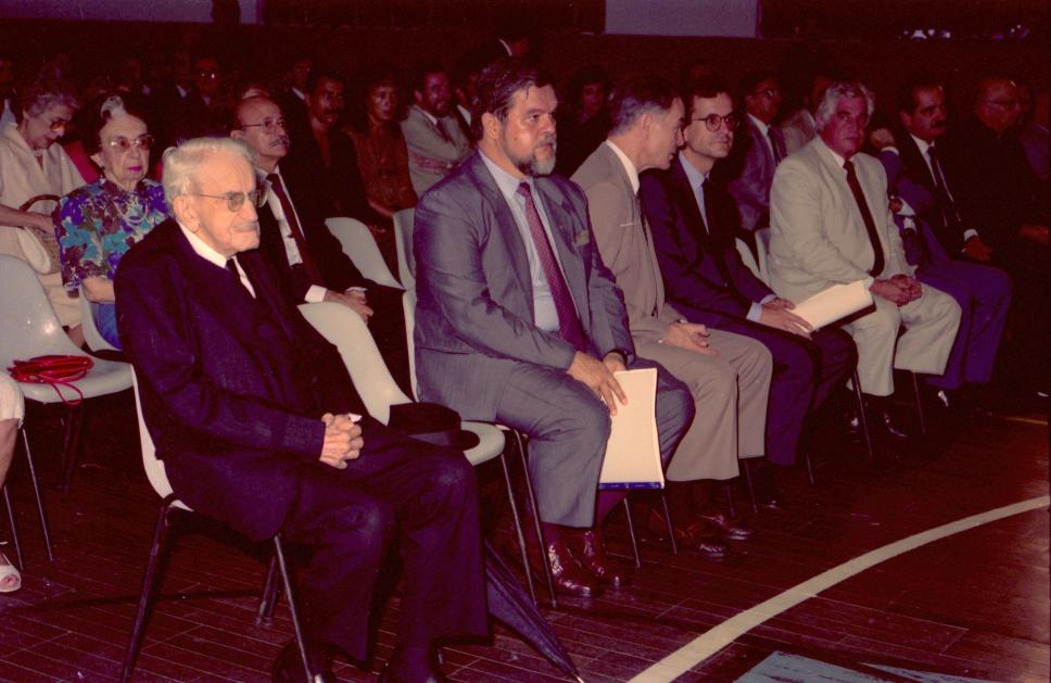 Cerimônia realizada no antigo Ginásio da PUC-Rio que concedeu o título de Doutor Honoris Causa a Sobral Pinto.