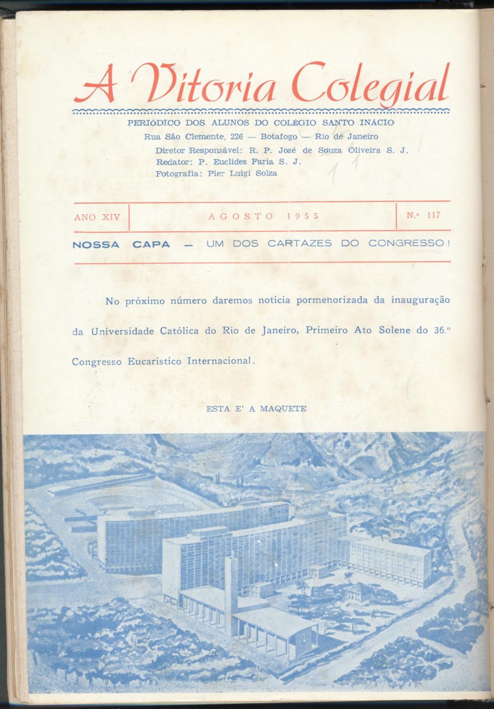 Capa da edição de número 117, de agosto de 1955, da revista A Vitória Colegial, que traz estampada a maquete do novo campus da PUC-Rio na Gávea, a ser inaugurado durante o 36º Congresso Eucarístico Internacional. Periódico dos alunos do Colégio Santo Inácio.