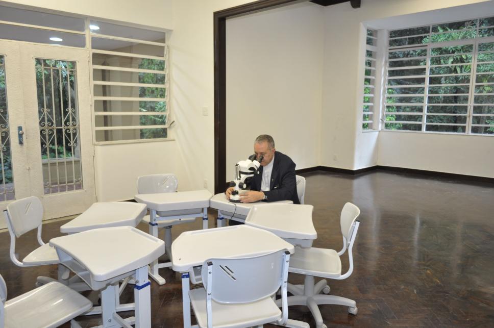 Pe. Josafá, S.J., utiliza um microscópio na sala de aula do curso de Ciências Biológicas da PUC-Rio.