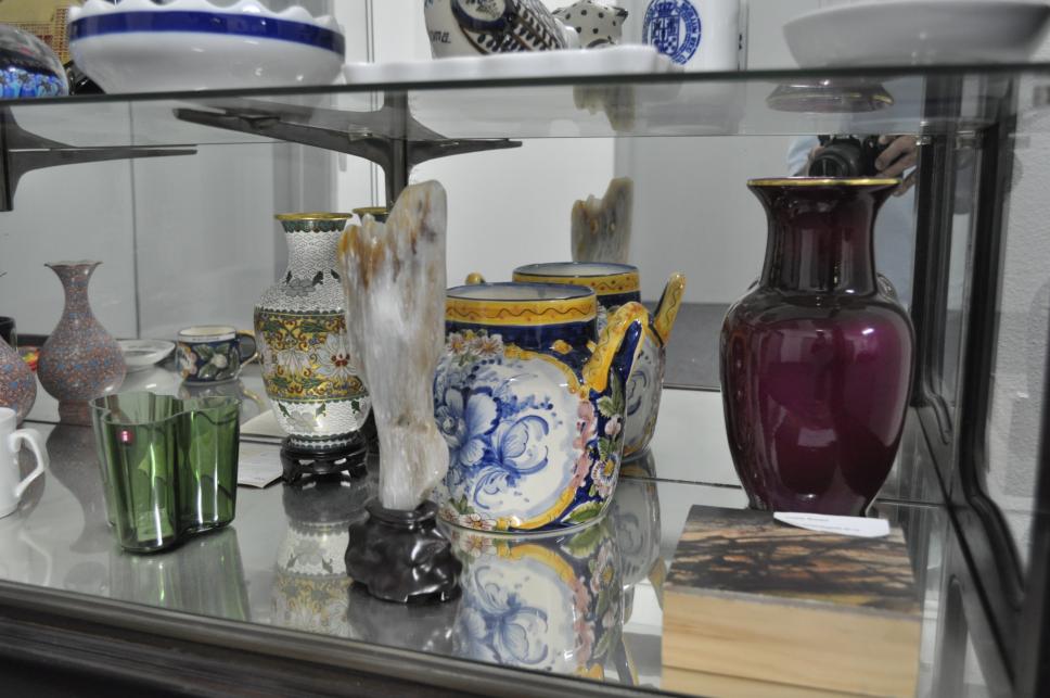 Armário da sala de entrada da reitoria da PUC-Rio com vasos, louças e memorabílias recebidas de instituições de ensino superior e empresas.