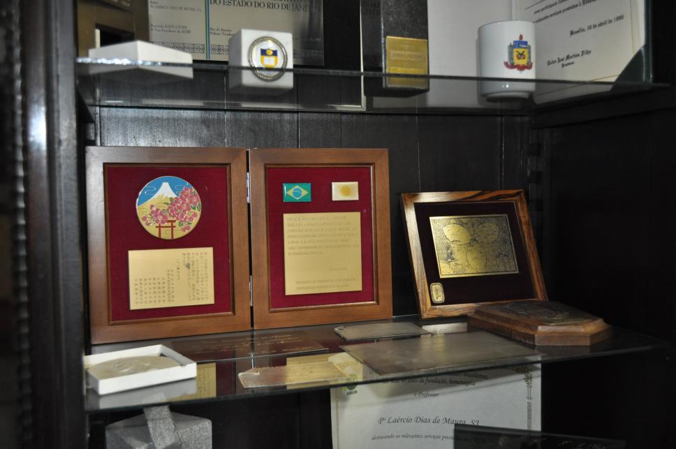 Armário da sala de entrada da reitoria da PUC-Rio com louças, diplomas, medalhas e placas recebidas de instituições de ensino superior e empresas.