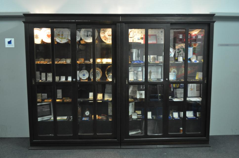 Armários da sala de entrada da reitoria com placas, medalhas, pratos brasonados, diplomas, esculturas e prêmios recebidos de instituições de ensino superior e de empresas, e flâmulas e memorabílias da PUC-Rio.
