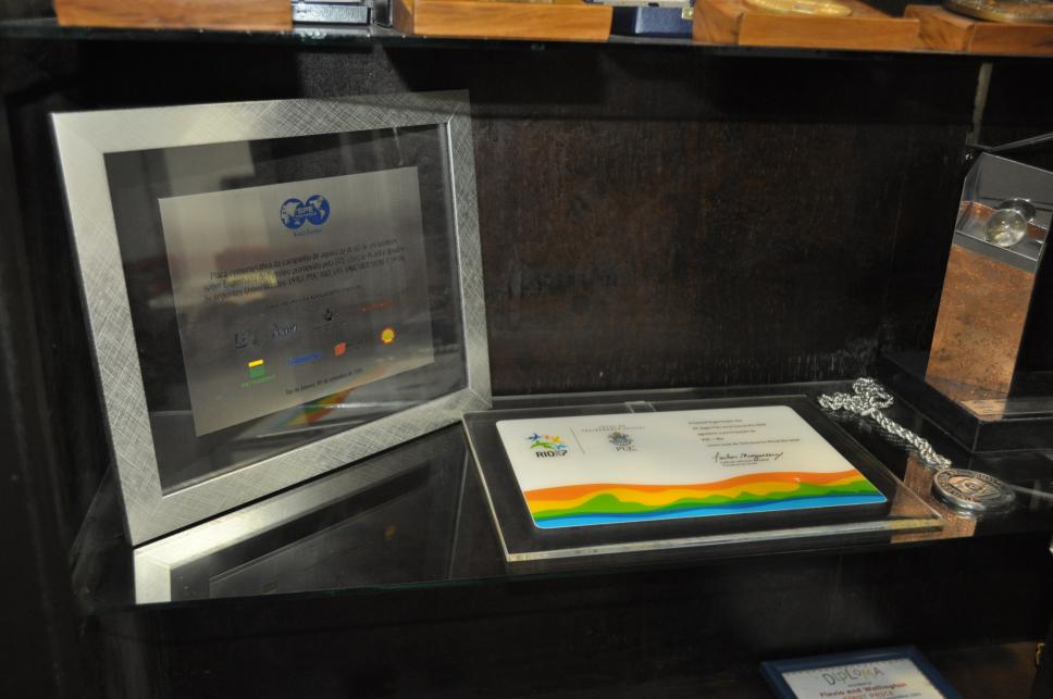 Diplomas, medalhas e esculturas do armário da sala de entrada da reitoria da PUC-Rio recebidas de instituições de ensino superior e empresas.