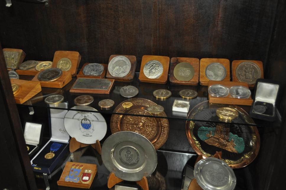 Pratos brasonados, medalhas e placas do armário da sala de entrada da reitoria recebidos de instituições de ensino superior e empresas ou confeccionados pela PUC-Rio.