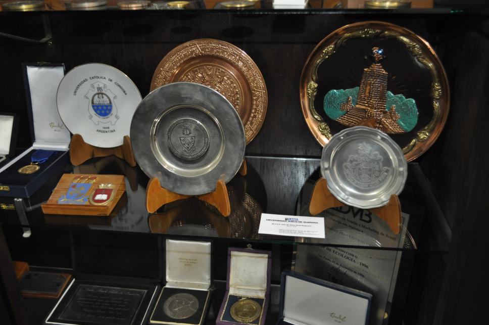 Pratos brasonados, medalhas e placas do armário da sala de entrada da reitoria recebidos de instituições de ensino superior e empresas ou confeccionados pela PUC-Rio.