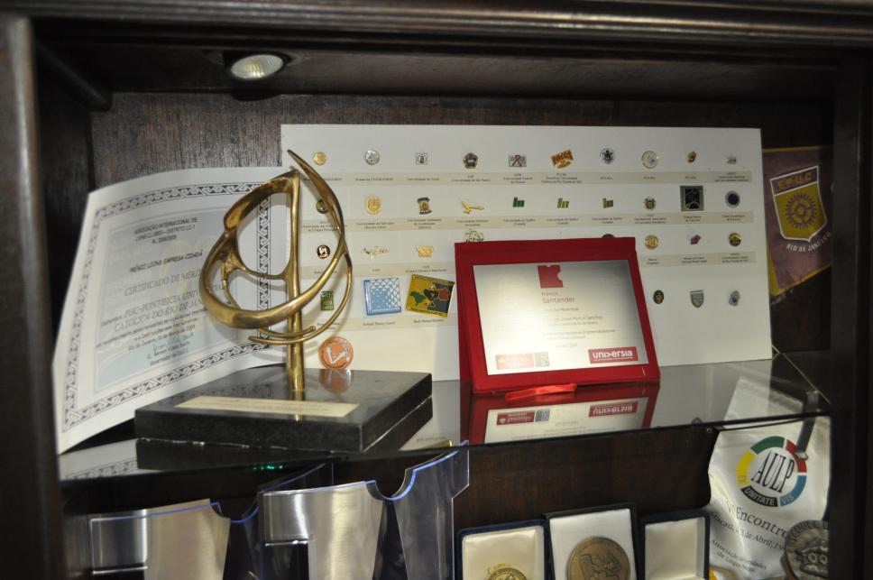 Medalhas, esculturas, diplomas, flâmulas, pins e bottons do armário da sala de entrada da reitoria recebidos de instituições de ensino superior e empresas ou confeccionados pela PUC-Rio.