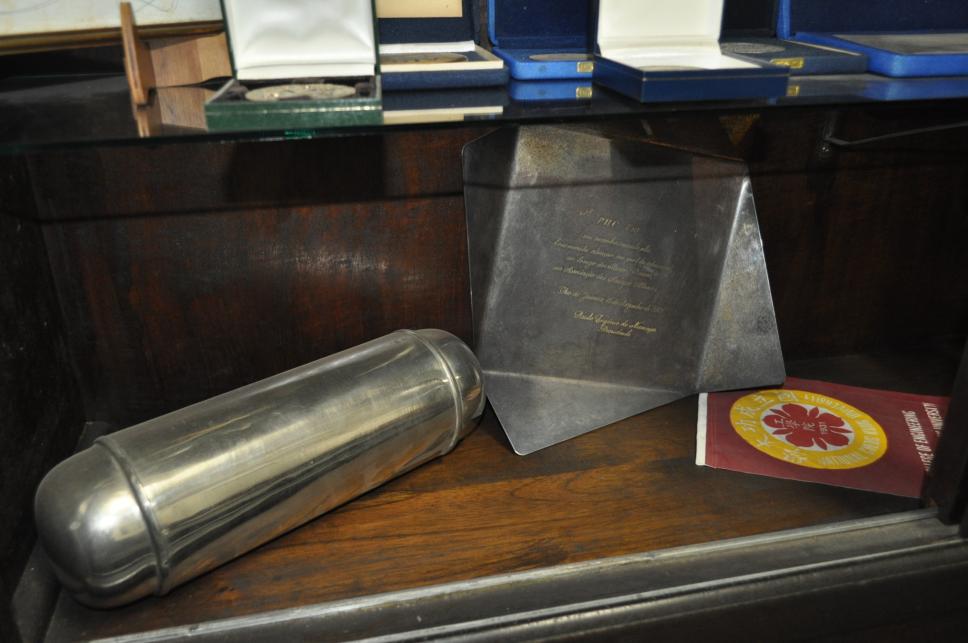 Medalhas, placas, flâmulas e esculturas do armário da sala de entrada da reitoria recebidas de instituições de ensino superior e empresas ou confeccionados pela PUC-Rio.