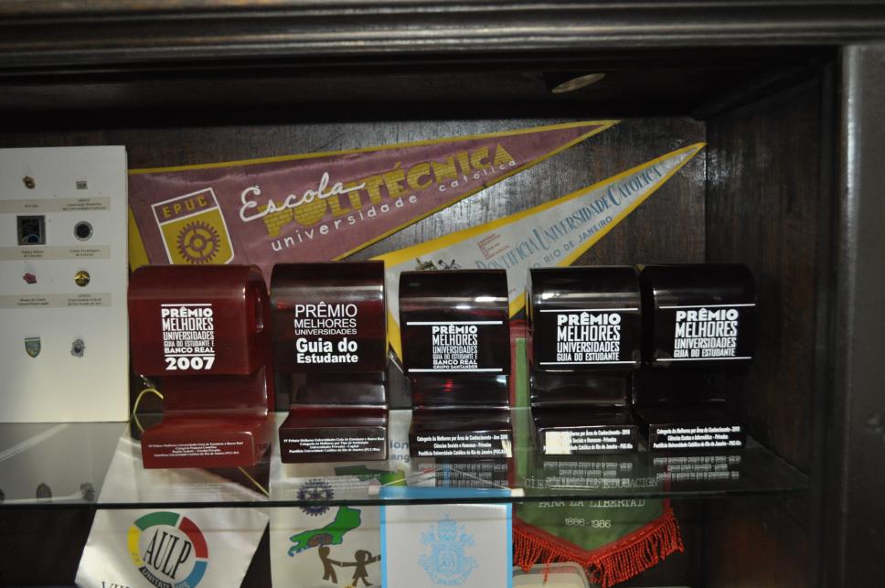Flâmulas, pins, bottons e prêmios de melhor universidade do armário da sala de entrada da reitoria recebidos de instituições de ensino superior e empresas ou confeccionados pela PUC-Rio.