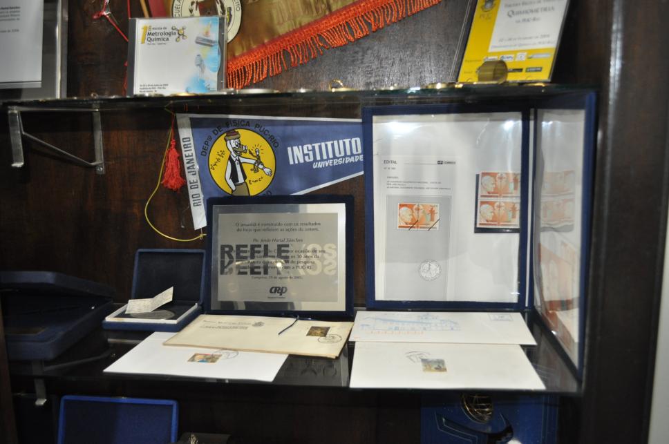 Flâmulas, medalhas, placas, cds e memorabílias do armário da sala de entrada da reitoria recebidos de instituições de ensino superior e empresas ou confeccionados pela PUC-Rio.