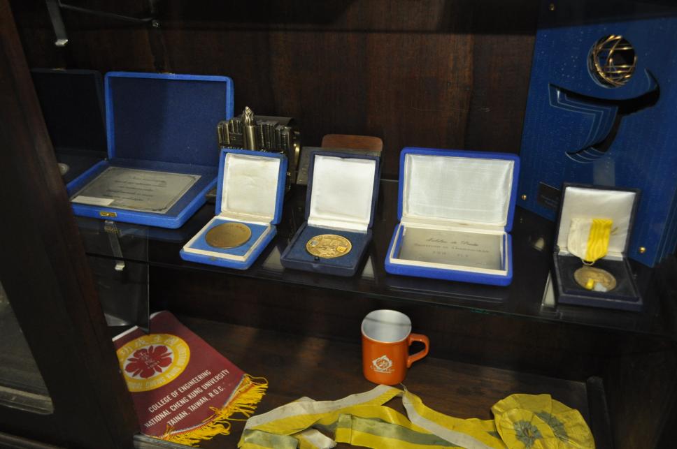 Flâmulas, medalhas, placas, esculturas, prêmios e memorabílias do armário da sala de entrada da reitoria recebidos de instituições de ensino superior e empresas ou confeccionados pela PUC-Rio.