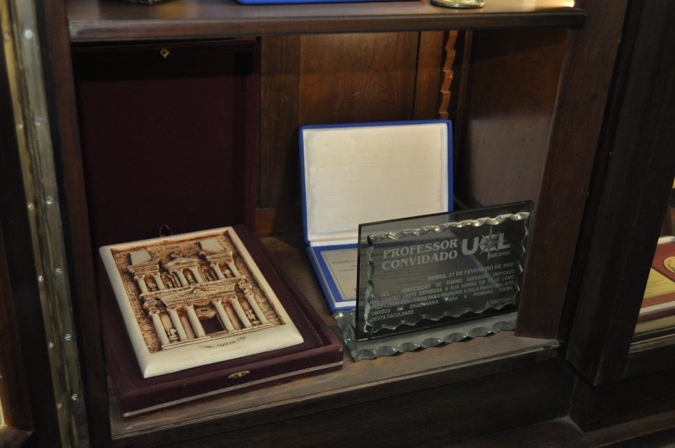Armário da sala de entrada da reitoria da PUC-Rio com placas e esculturas recebidas de instituições de ensino superior.