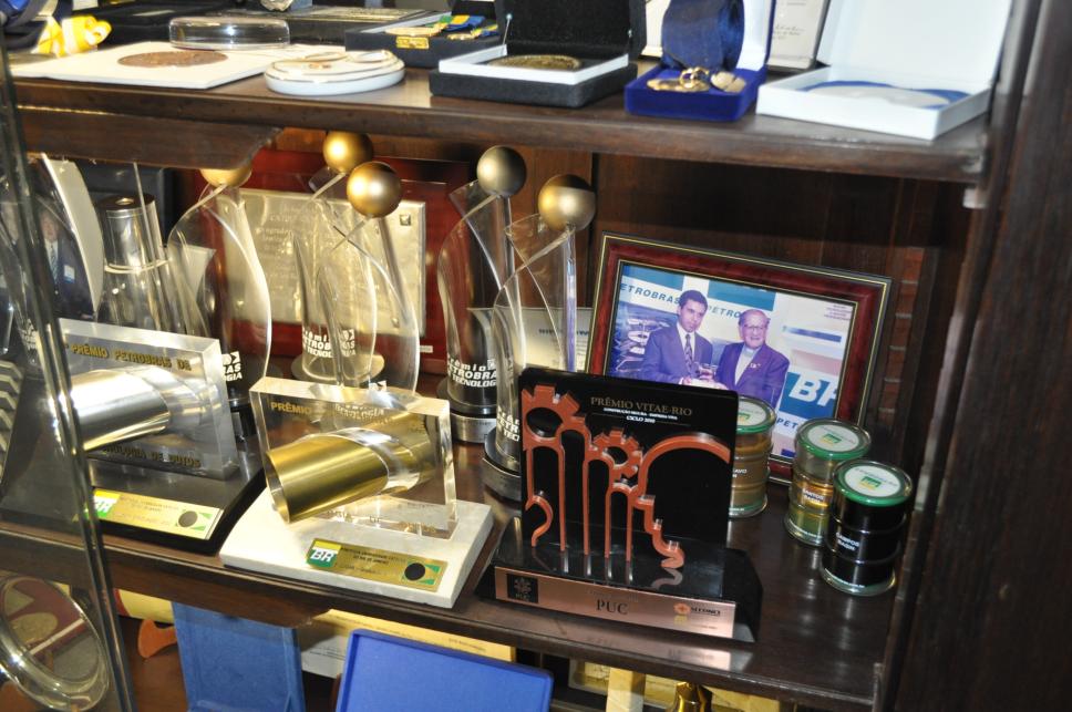 Armário da sala de entrada da reitoria com medalhas, placas e prêmios recebidos de instituições de ensino superior e empresas, e um porta-retrato do pe. Jesús Hortal Sànchez, S.J., com uma autoridade.
