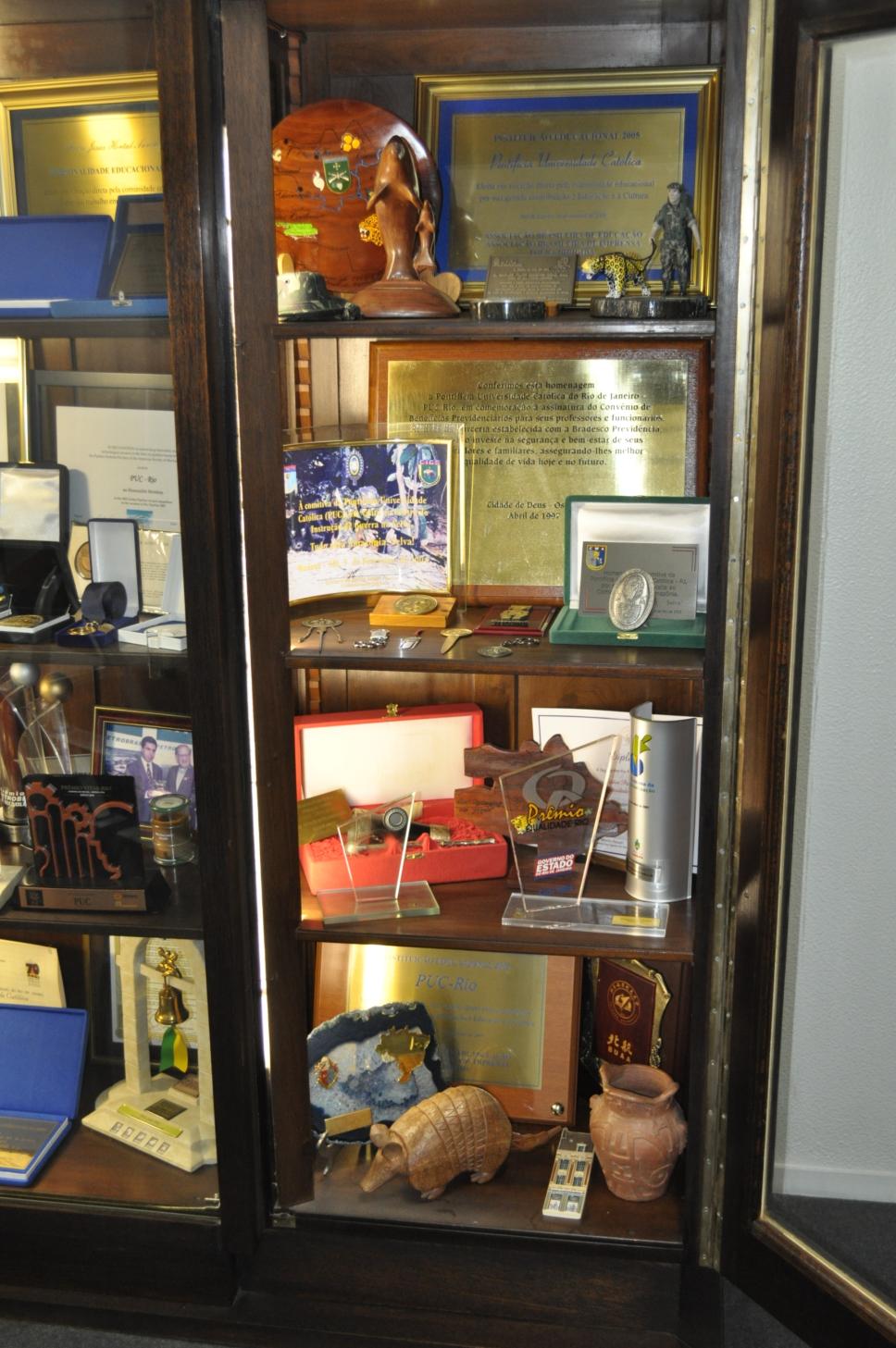 Armário da sala de entrada da reitoria com medalhas, placas, diplomas, esculturas e prêmios recebidos de instituições de ensino superior e empresas, memorabílias da PUC-Rio e um porta-retrato do pe. Jesús Hortal Sànchez, S.J., com autoridade.