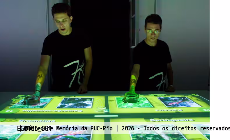 Monitores da exposição PUC-Rio 70 Anos, Rumo aos 80 interagem com a mesa de jogos da sala Jogos da Memória.
