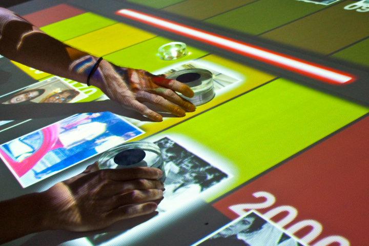 Mesa de jogos interativa da sala Jogos da Memória da exposição PUC-Rio 70 Anos, Rumo aos 80.