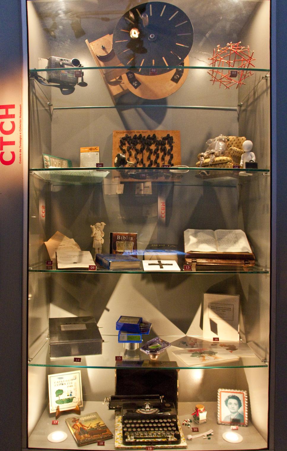 Estante com documentos, equipamentos, fotografia e objetos dos departamentos do Centro de Teologia e Ciências Humanas da sala Ícones da exposição PUC-Rio 70 Anos, Rumo aos 80.