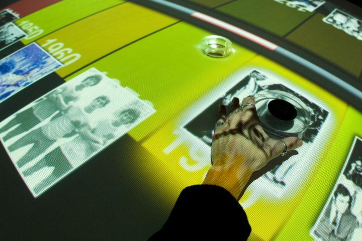 Mesa interativa da sala Jogos de Memória da exposição PUC-Rio 70 Anos, Rumo aos 80.