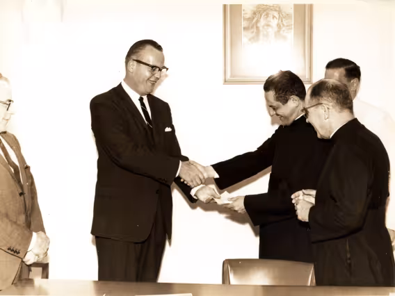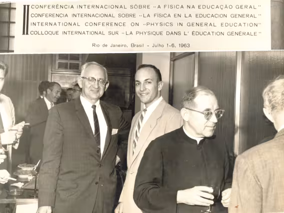 Documentos dos armários da sala de entrada da reitoria com álbum de fotografias dos formandos da EPUC, fotos dos reitores, documentos do cotidiano da Universidade, placas, medalhas, escultura e pratos brasonados recebidos de insituições e empresas, e memorabílias da PUC-Rio.