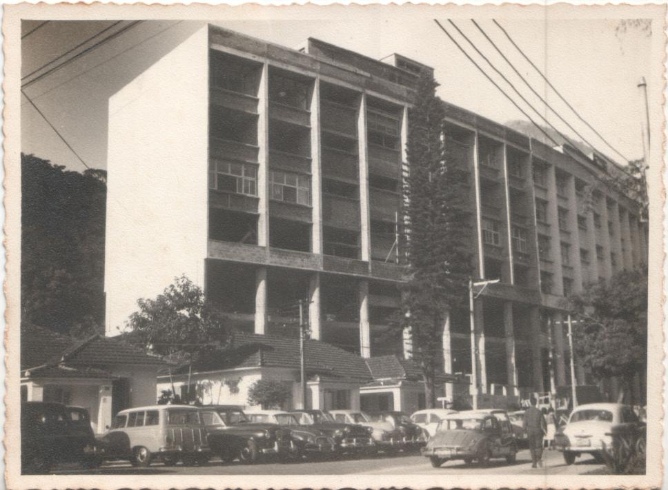 Fachada do Edifício Cardeal Leme em 1961, antes da construção dos blocos de Física e Química. Algumas das casas ainda estavam em sua configuração original.