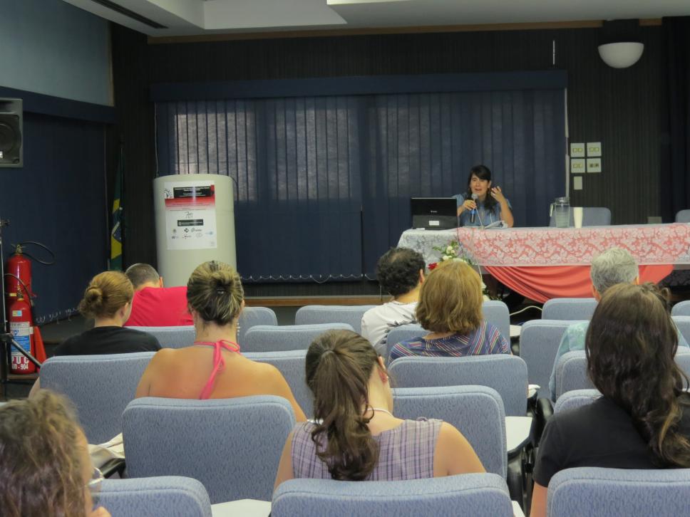 Plateia observa atentamente a conferencista no I Seminário Latino-Americano de Geografia e Gênero: Espaço, Gênero e Poder no auditório Padre Anchieta, organizado pelo Departamento de Geografia da PUC-Rio.