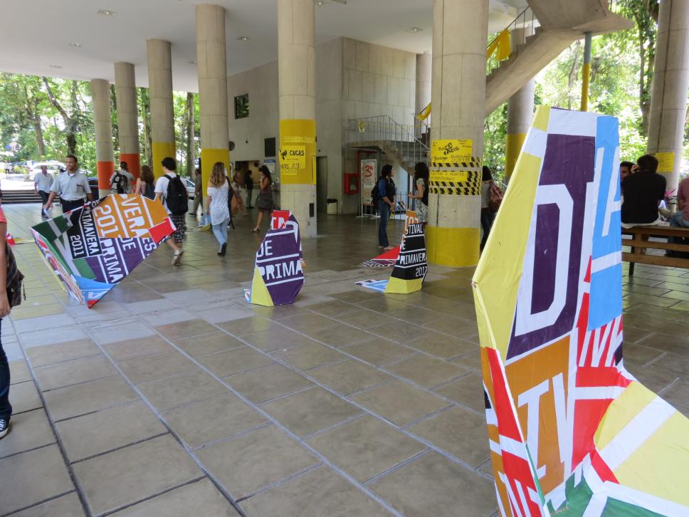 Decoração nos pilotis da ala Kennedy para divulgação do Festival de Primavera 2011. Faixas e cartazes de divulgação das chapas para os centros acadêmicos e o DCE.