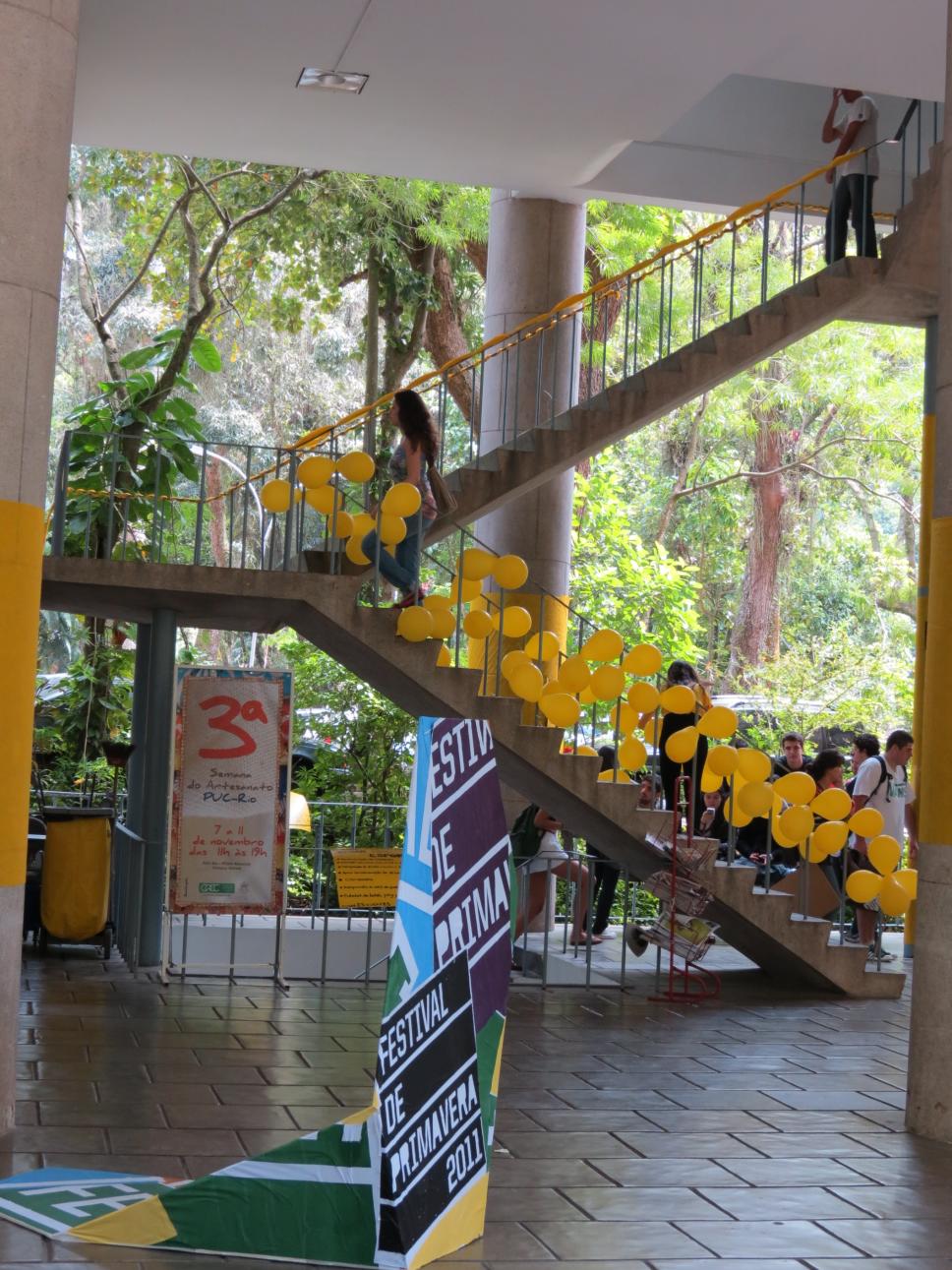 Ala Kennedy com uma placa com o cartaz da 3ª Semana de Artesanato da PUC-Rio e um totem do Festival de Primavera 2011. Escada com decoração de chapa concorrente às eleições estudantis.