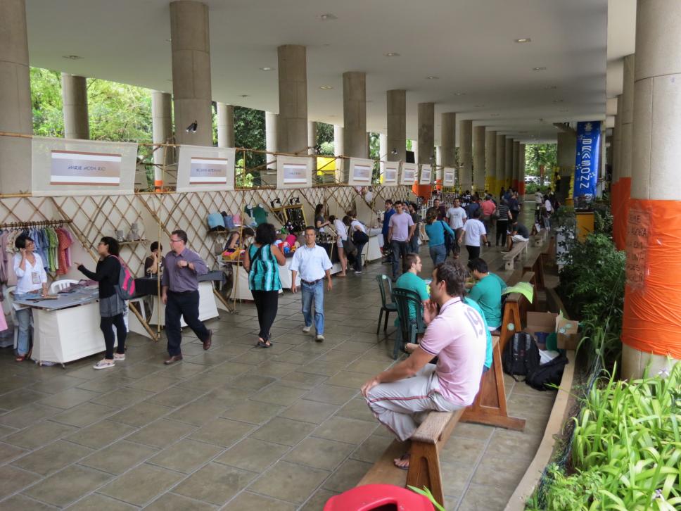 Barracas dos expositores feitas de bambu para exibição e comercialização de roupas, bolsas, objetos de decoração e brinquedos durante a 3ª Semana de Artesanato da PUC-Rio.