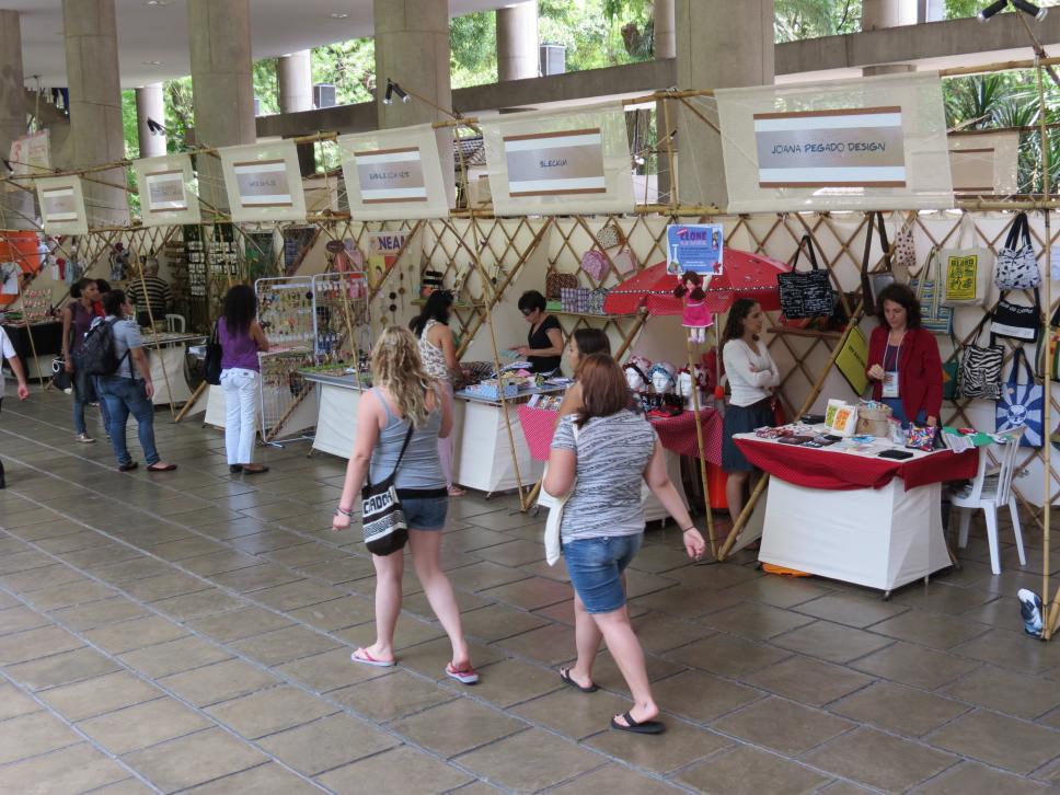Barracas de bambu dos expositores com roupas, bolsas, objetos de decoração e brinquedos na 3ª Semana de Artesanato da PUC-Rio.