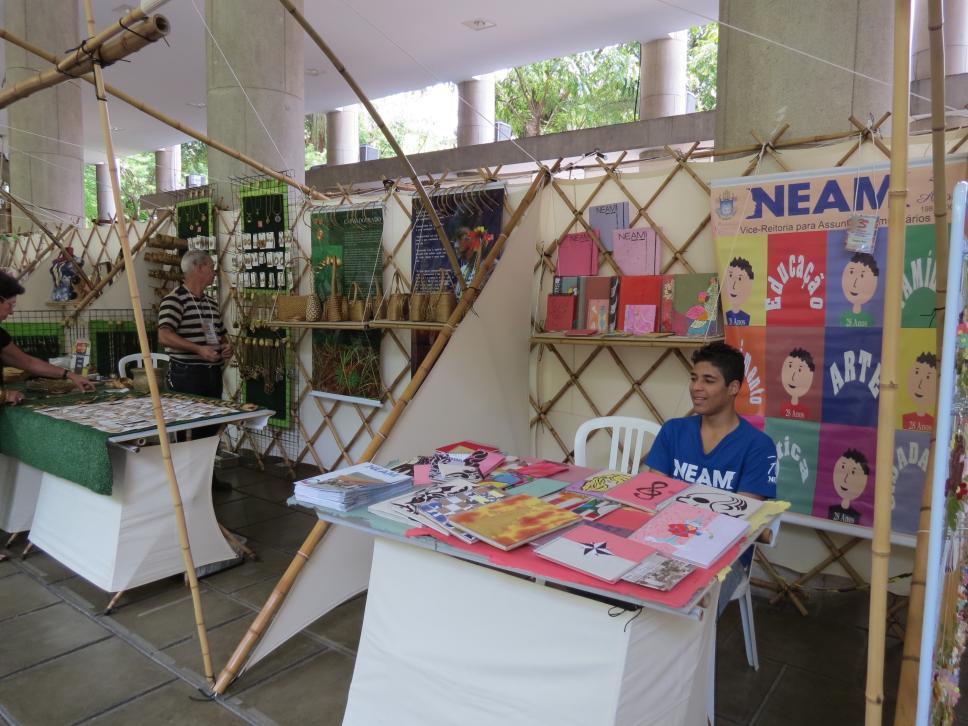 Barracas dos NEAM (Núcleo de Estudo e Ação Sobre o Menor) e do expositor de bolsas e bijuterias feitas de bambu na 3ª Semana de Artesanato da PUC-Rio.
