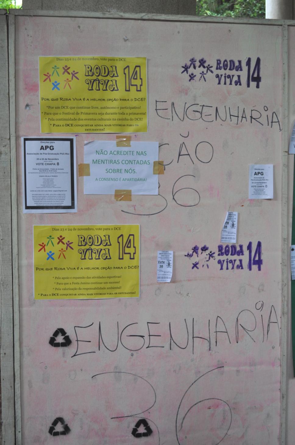 Painel fixado nos pilotis da ala Kennedy com propagandas das chapas que concorrem às eleições de 2011 para o Diretório Central dos Estudantes da PUC-Rio (DCE). Chapas Roda Viva, Consenso, e outras.