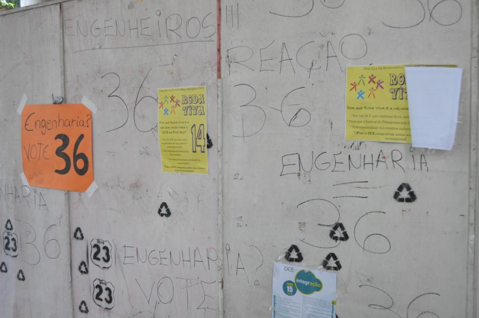 Painel fixado nos pilotis da ala Kennedy com propagandas das chapas que concorreram às eleições de 2011 para o Diretório Central dos Estudantes da PUC-Rio (DCE). Chapas Roda Viva, Integração, e outras.
