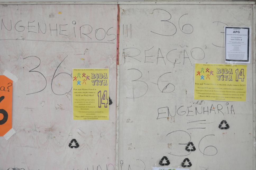 Painel fixado nos pilotis da ala Kennedy com propagandas das chapas que concorreram às eleições de 2011 para o Diretório Central dos Estudantes da PUC-Rio (DCE). Chapas Roda Viva, Integração, e outras.