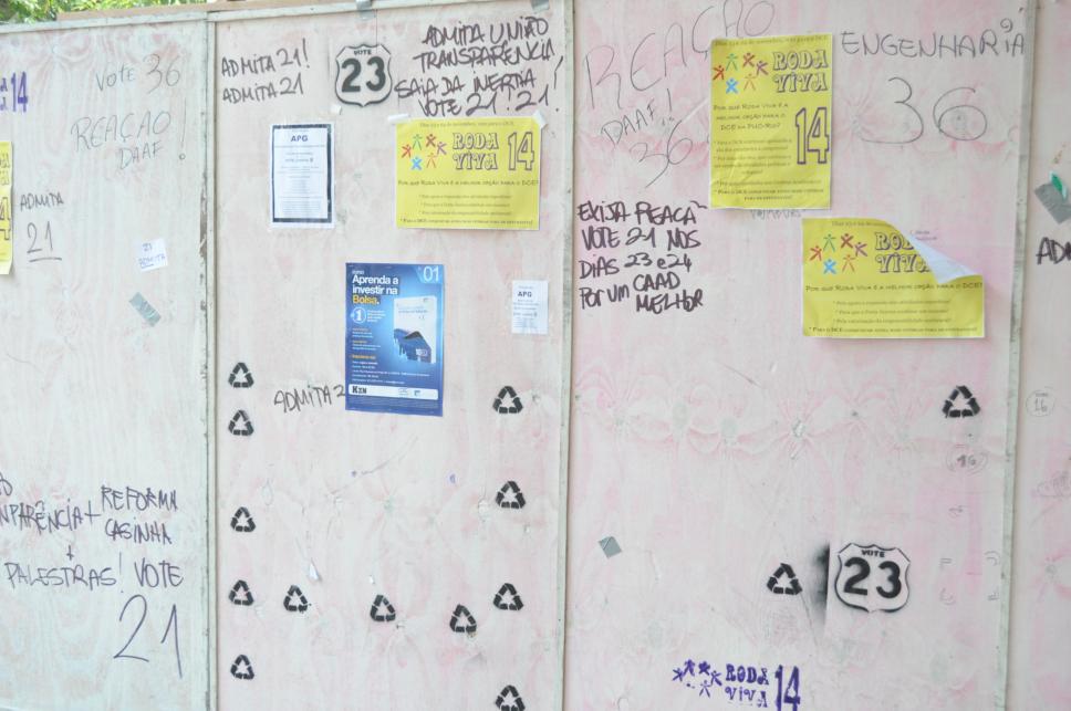 Painel fixado nos pilotis da ala Kennedy com propagandas das chapas que concorreram às eleições de 2011 para o Diretório Central dos Estudantes da PUC-Rio (DCE). Chapas Roda Viva, Reação, e outras.