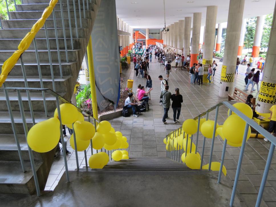 Intervenção com faixa laranja e balões amarelos nas escadas do edifício da Amizade com propaganda de chapas que disputaram as eleições de 2011 para o Diretório Central dos Estudantes da PUC-Rio (DCE).
