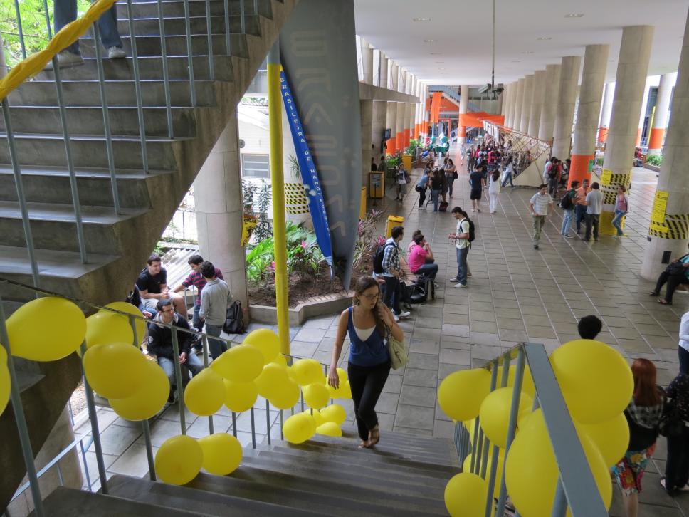 Intervenção com faixas laranja e amarela, e balões amarelos, nas escadas e pilotis do edifício da Amizade, com propaganda de chapas que disputaram as eleições de 2011 para o Diretório Central dos Estudantes da PUC-Rio (DCE).