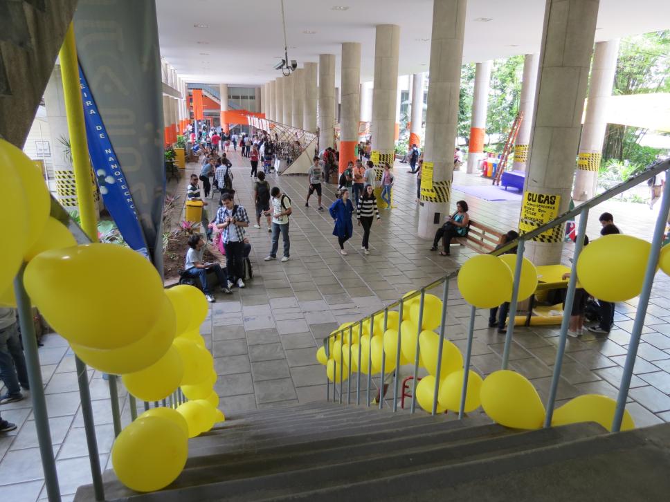 Intervenção com faixas laranja e amarela, e balões amarelos, nas escadas e pilotis do edifício da Amizade, com propaganda de chapas que disputaram as eleições de 2011 para o Diretório Central dos Estudantes da PUC-Rio (DCE).