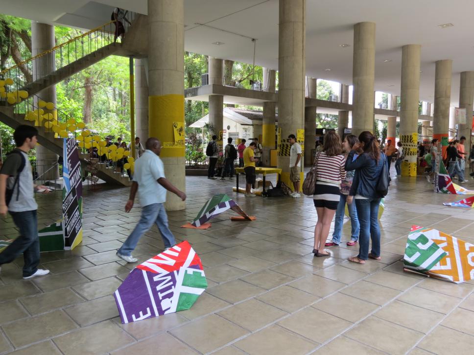 Intervenção com faixas laranja e amarela, e balões amarelos, nas escadas e pilotis do edifício da Amizade, com propaganda de chapas que disputaram as eleições de 2011 para o Diretório Central dos Estudantes da PUC-Rio (DCE). Propaganda do Festival da Primavera.