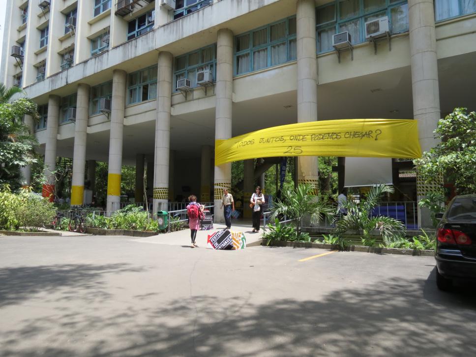 Intervenção com faixas amarelas nos pilotis do edifício da Amizade, com propaganda de chapas que disputaram as eleições de 2011 para o Diretório Central dos Estudantes da PUC-Rio (DCE). Propaganda do Festival da Primavera.