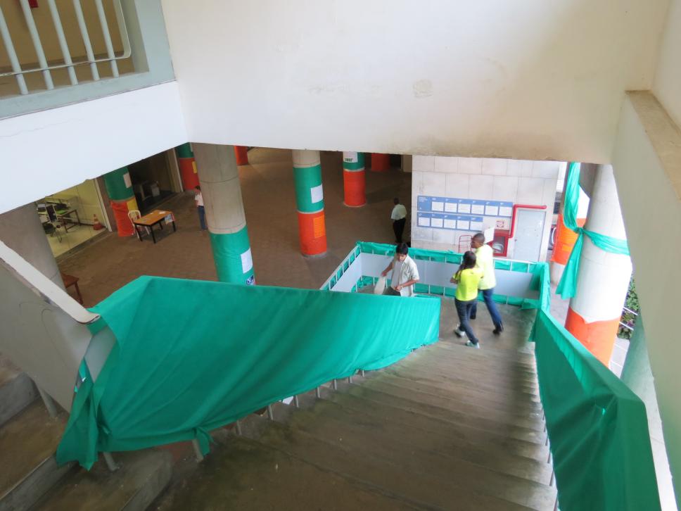 Escadas e pilotis do Bloco D do edifício Cardeal Leme decorados com faixas laranja e verde com propagandas de chapas que disputavam as eleições de 2011 para o Diretório Central dos Estudantes da PUC-Rio (DCE).