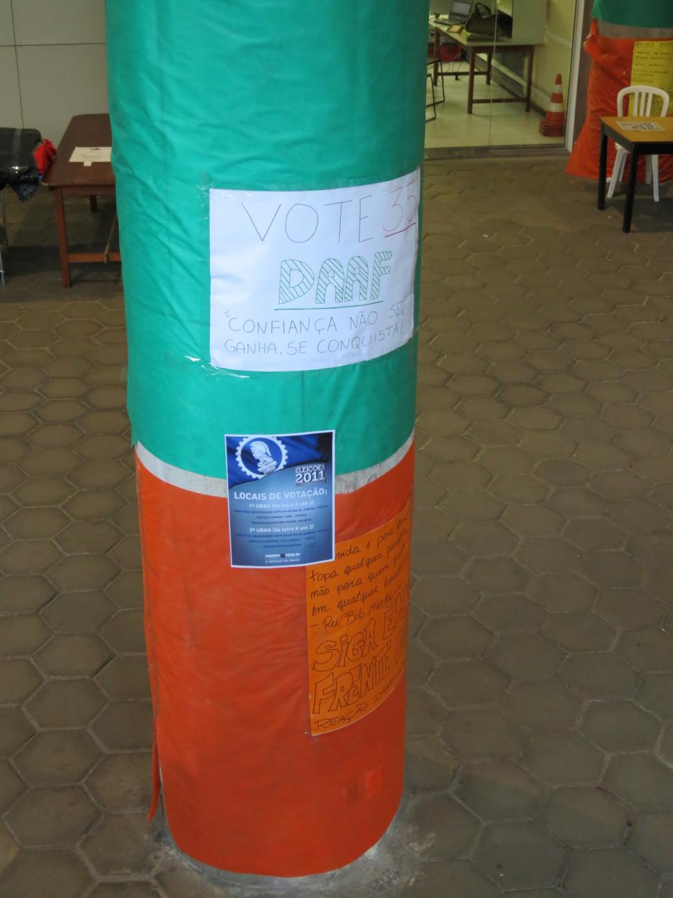Propagandas em um piloti do edifício Cardeal Leme decorado com faixas laranja e verde. Eleições de 2011 para o Diretório Central dos Estudantes da PUC-Rio (DCE).