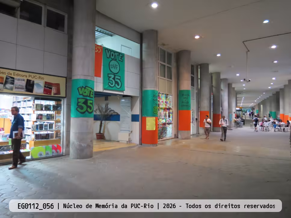 Pilotis do edifício Cardeal Leme decorado com faixas laranja e verde com propagandas de chapas que disputavam as eleições de 2011 para o Diretório Central dos Estudantes da PUC-Rio (DCE). Em frente à livraria Carga Nobre e a Empresa Júnior.