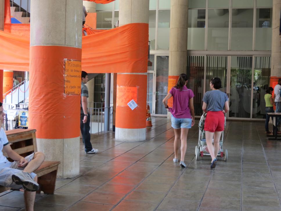 Pilotis decorado com faixas laranja com propagandas de chapas que disputavam as eleições de 2011 para o Diretório Central dos Estudantes da PUC-Rio (DCE). Mãe passeia com carrinho de bebê.