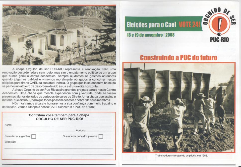 Folheto com o programa da chapa Orgulho de Ser PUC-Rio para as eleições estudantis, centro acadêmico de Direito. O folheto utiliza sem autorização duas fotos do acervo do Núcleo de Memória, uma da Vila dos Diretórios nos anos 1960 e outra de trabalhadores carregando a forma de um piloti em 1953. A mesma chapa publicou uma série de cartazes com fotos antigas da PUC-Rio, todas do acervo do Núcleo de Memória e sem autorização de uso.