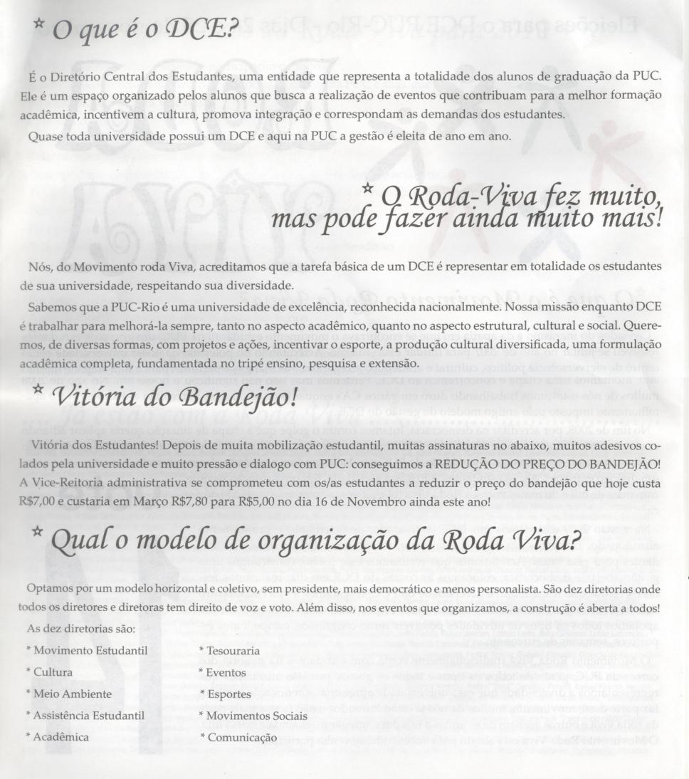 Folheto com o programa da chapa Roda Viva para as eleições estudantis. "O que é o DCE?", "O Roda Viva fez muito mas pode fazer ainda muito mais!", "Vitória do Bandejão!" e "Qual o modelo de organização da Roda Viva?".