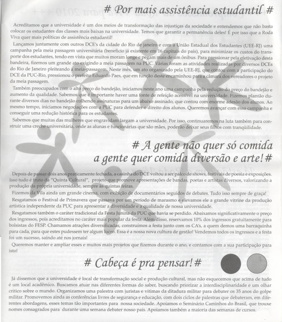 Folheto com o programa da chapa Roda Viva para as eleições estudantis. "Por mais assistência estudantil", "A gente não quer só comida a gente quer comida diversão e arte!" (Quinta Cultural, Festival de Primavera, Festa Junina), "Cabeça é pra pensar!".