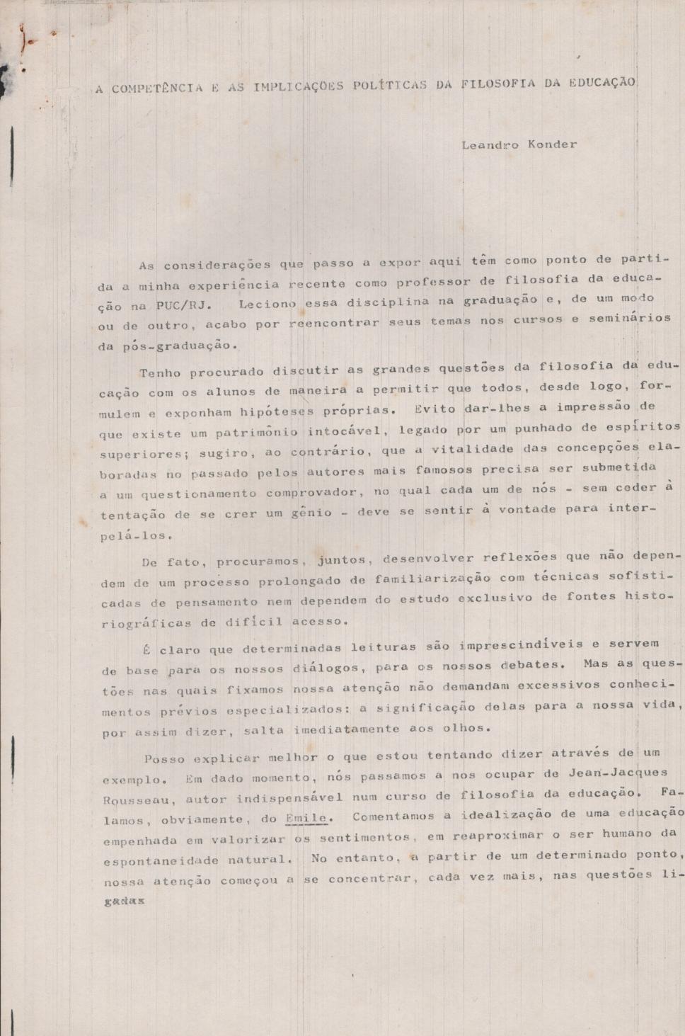 Artigo intitulado 'A competência e as implicações políticas da filosofia da educação', de autoria do professor Leandro Konder, apresentado no Seminário dos 20 anos do mestrado em Educação da PUC-Rio.