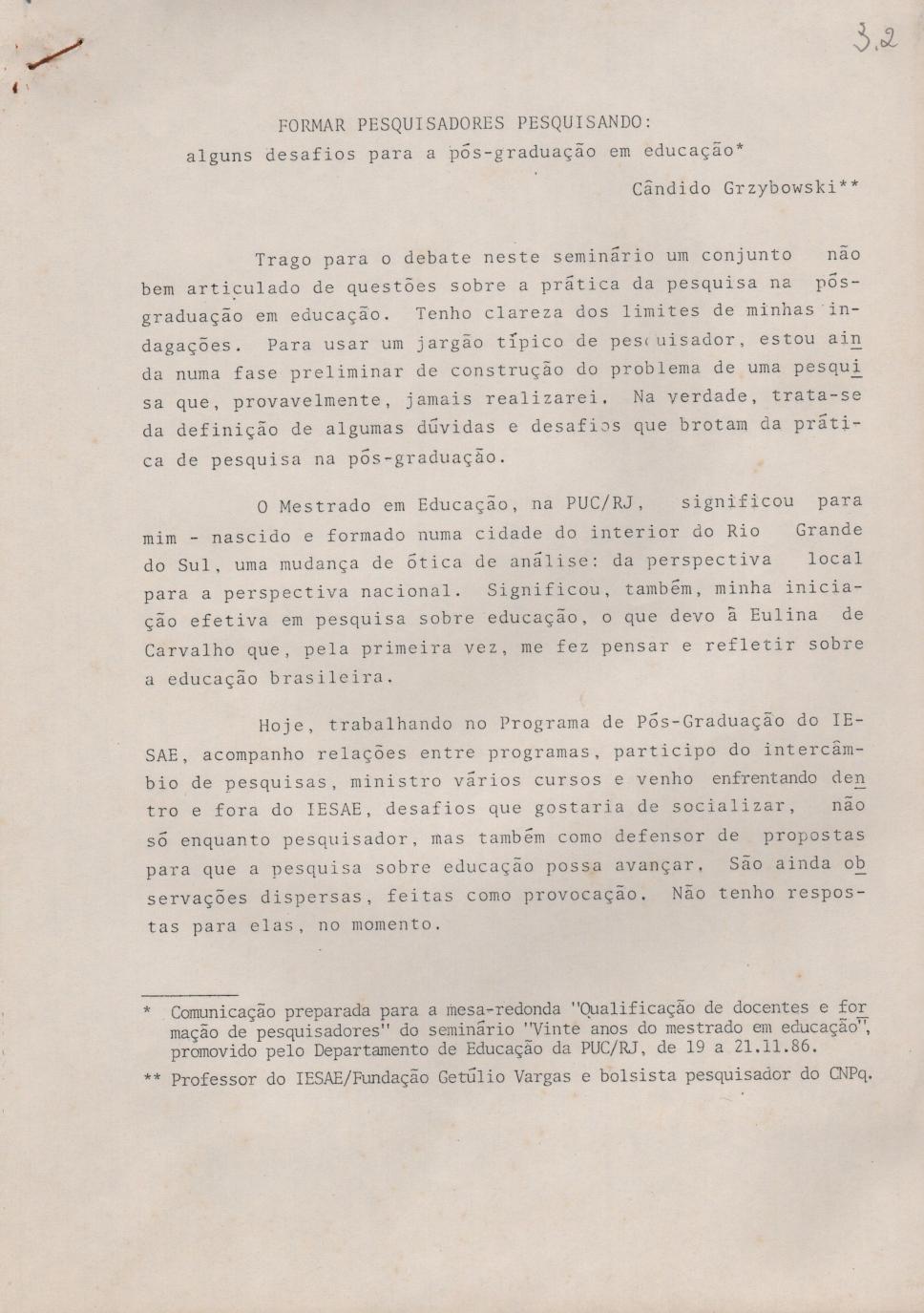 Artigo intitulado 'Formar pesquisadores pesquisando: alguns desafios para a pós-graduação em educação', de autoria do professor Cândido Grzybowski, apresentado no Seminário dos 20 anos do mestrado em Educação da PUC-Rio.