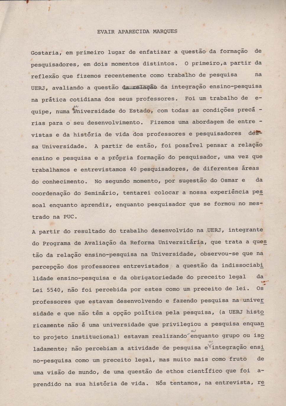 Artigo de autoria da professora Evair Aparecida Marques apresentado no Seminário dos 20 anos do mestrado em Educação da PUC-Rio.