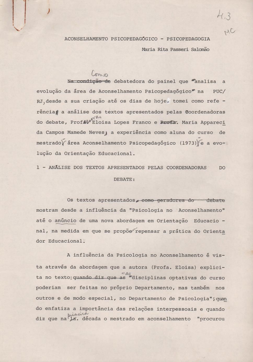 Artigo de autoria da professora Maria Rita Passeri Salomão intitulado 'Aconselhamento Psicopedagógico - Psicopedagogia', apresentado no seminário dos 20 anos do mestrado em Educação da PUC-Rio.
