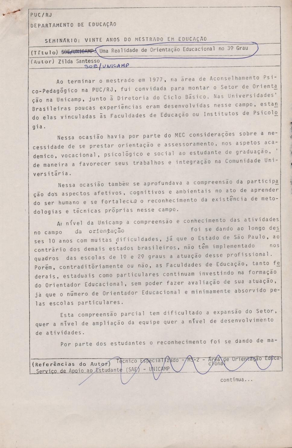 Artigo intitulado 'SOE/UNICAMP: Uma realidade de orientação educacional no 3º grau' de autoria da orientadora educacional Zilda Santesso, apresentado no seminário dos 20 anos do mestrado em Educação da PUC-Rio.